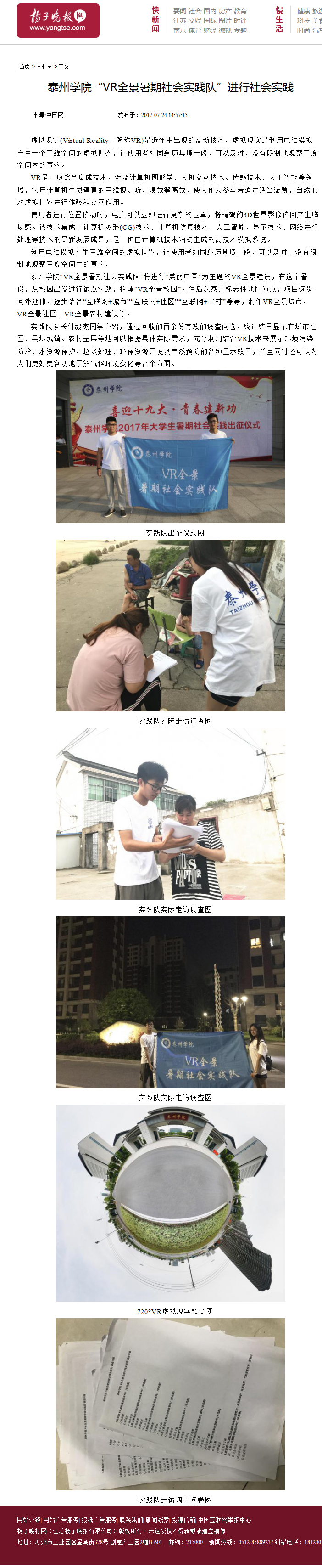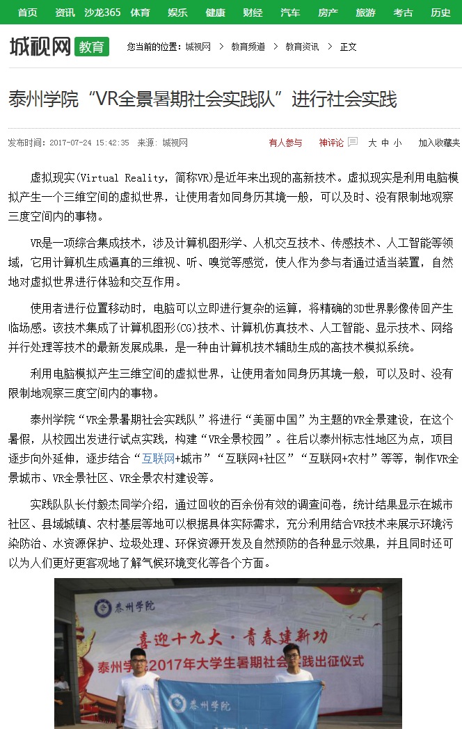 永利集团“VR全景暑期社会实践队”将进行“美丽中国”为主题的VR全景建设,在这个暑假,从校园出发进行试点实践,构建“VR全景校园”。往后以泰州标志性地区为点,项目逐步向外延伸,逐步结合“互联网+城市”“互联网+社区”“互联网+农村”等等,制作VR全景城市、VR全景社区、VR全景农村建设等。