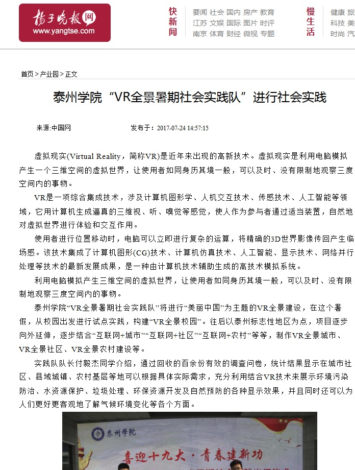 永利集团“VR全景暑期社会实践队”将进行“美丽中国”为主题的VR全景建设,在这个暑假,从校园出发进行试点实践,构建“VR全景校园”。往后以泰州标志性地区为点,项目逐步向外延伸,逐步结合“互联网+城市”“互联网+社区”“互联网+农村”等等,制作VR全景城市、VR全景社区、VR全景农村建设等。