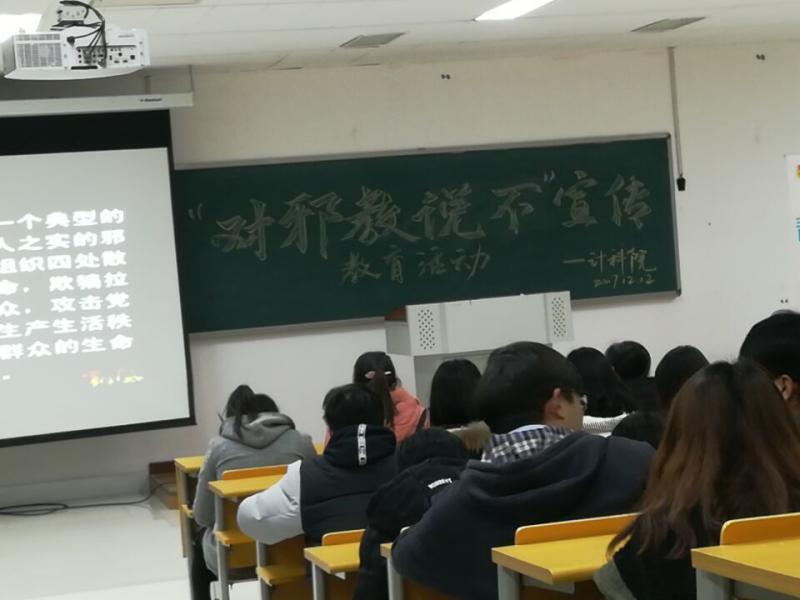 2017年12月12日晚,由计算机科学与技术学院学生会办公室组织举行了的“对邪教说不”专题宣传教育活动于教学楼A2307拉开帷幕。