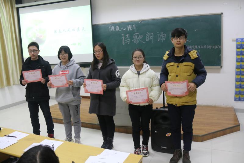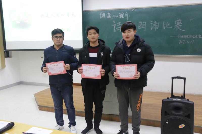 20171227日晚上7点,计算机科学与技术学院宣传部举办的健康心理月“乘阳光之舟,赴健心之约”朗诵比赛在教学楼A3108举行,担任此次比赛的评委有学生会副主席谢欣芮,办公室主任李婷婷,宣传部部长鞠燕,纪检部部长顾光辰,体育部部长武真贤以及学习部副部长胡露露。