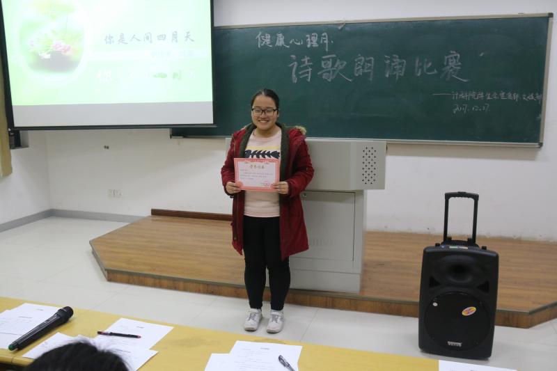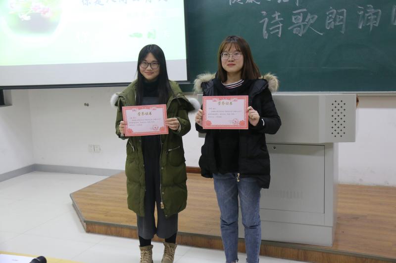 此次进入决赛的有12个人,以抽签的方式来决定他们的比赛顺序。首先上场的是袁绍飞、闫佳怡组合,一首《给战斗者》点燃全场气氛。接下来,黄辰同学的《青春的诗》、姜美美同学的《走西口》、王玉蓉同学的《当你老了》、吴建航同学的《江南,我愿做你怀中的一直清莲》和徐姝彤同学的《面朝大海,春暖花开》,配以悠扬缱绻的音乐,使现场观众感受到诗人的细腻情怀。许佳文同学的《致大海》、陈浩铨同学的《以梦为马》和冯金星同学的《沁园春·雪》,以饱满的激情让同学们心中久久不能平静。其中,经管学院的董耀同学特地来到现场,为我们带来了《将进酒》的精彩朗诵。本次比赛给观众印象最深的当属张硕萍同学朗诵的《少年中国说》,其以“巾帼不让须眉”的气概赢得本次比赛的冠军。