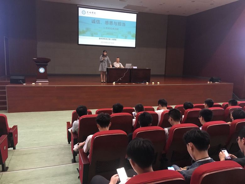 讲座由关工委的退休老教师孙爱斌主讲,主题为“诚信、感恩与担当”,主讲内容主要是为学生解读经典,他告诉同学们阅读经典,不仅是为了增长知识,更是要从中吸取精神资源。同时,从经典中讲解了诚信和感恩的重要意义。