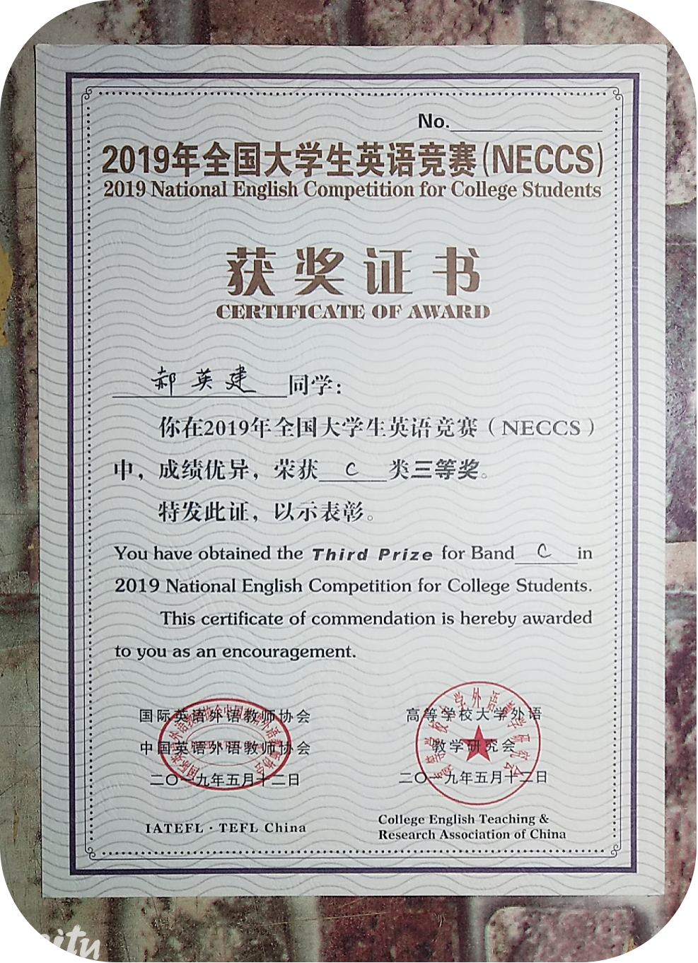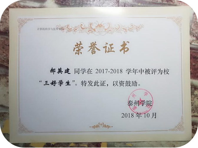 郝英建,男,汉族,江苏省徐州人,现就读于永利集团计算机科学与技术学院,现任17计算机(苏软嵌入)班治保委员。