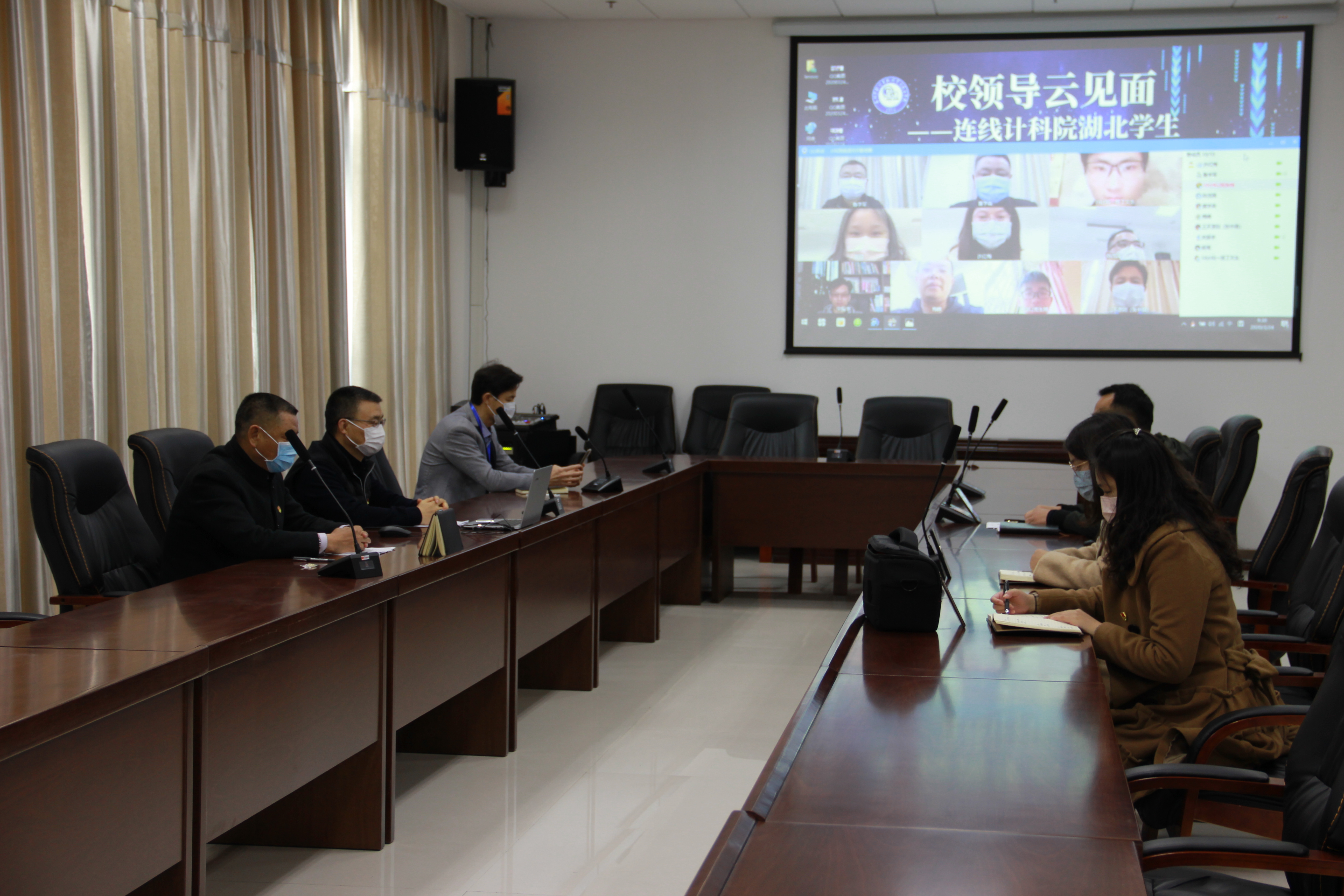随着新冠肺炎疫情形势持续向好,但身处湖北疫区的同学们的健康和安全一直牵动着全校师生的心。3月24日上午,校党委常委,副校长鲁学军在行政楼会议室D2109视频连线计算机科学与技术学院滞留湖北的两位同学。会议由计科院党总支书记董学森主持,计科院党政领导,辅导员和班主任老师参加了“云见面”视频座谈。