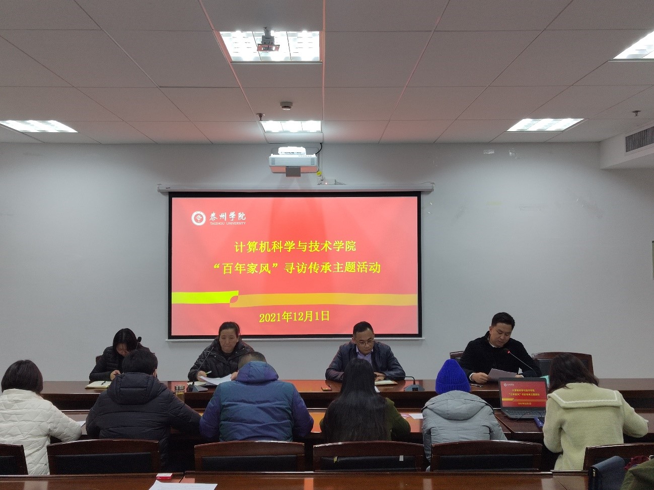为庆祝中国共产党成立100周年,从党史学习中继承和赓续革命前辈的好家风好作风,2021年12月1日,计算机科学与技术学院在D2307开展“百年家风”寻访传承主题活动。活动由学院副院长、纪检委员钱进同志主讲,我院全体教职工参加活动。