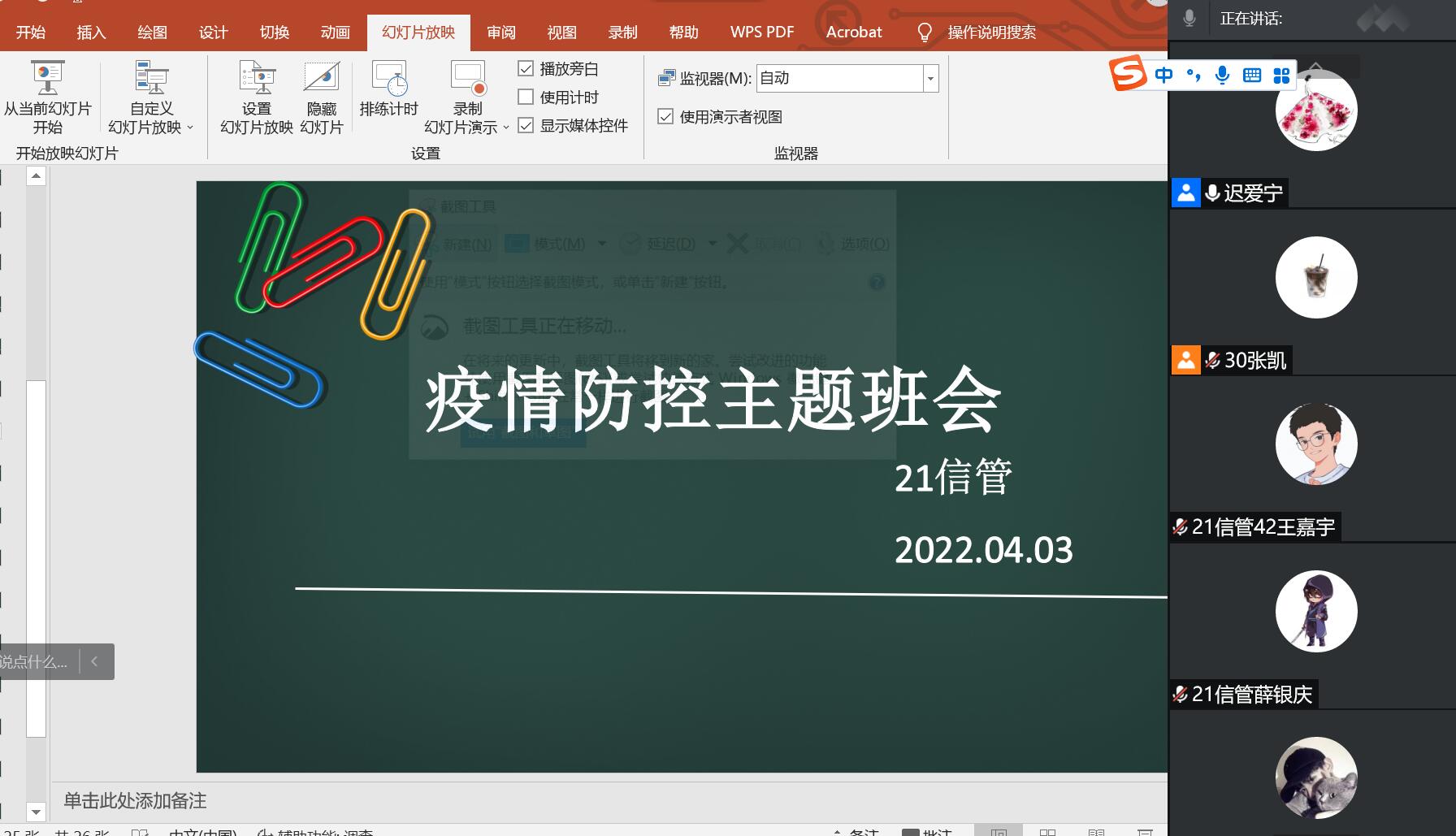 为进一步落细落实疫情防控工作,4月3日下午,计算机科学与技术学院各班级班主任通过视频会议方式召开疫情防控系列班会,学院各班级班主任、各班级全体学生参加会议。