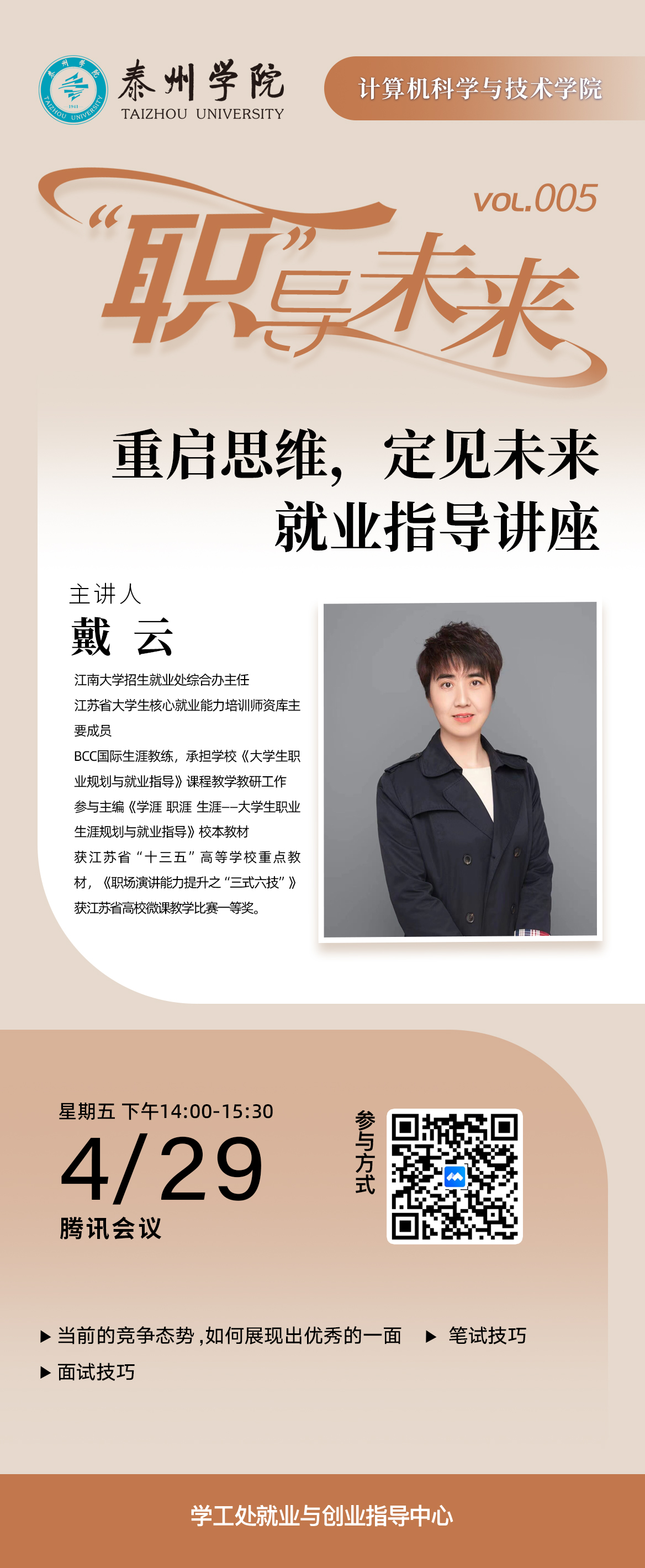 4月29日下午,我院举办了“职导未来”系列“重启思维,定见未来”就业指导讲座,邀请了江南大学招生就业处综合办主任戴云作为主讲人,对毕业生们进行就业路上的战略、策略及战术指导。党总支副书记栾吉主持了这场线上讲座,全院200余名学生聆听讲座。