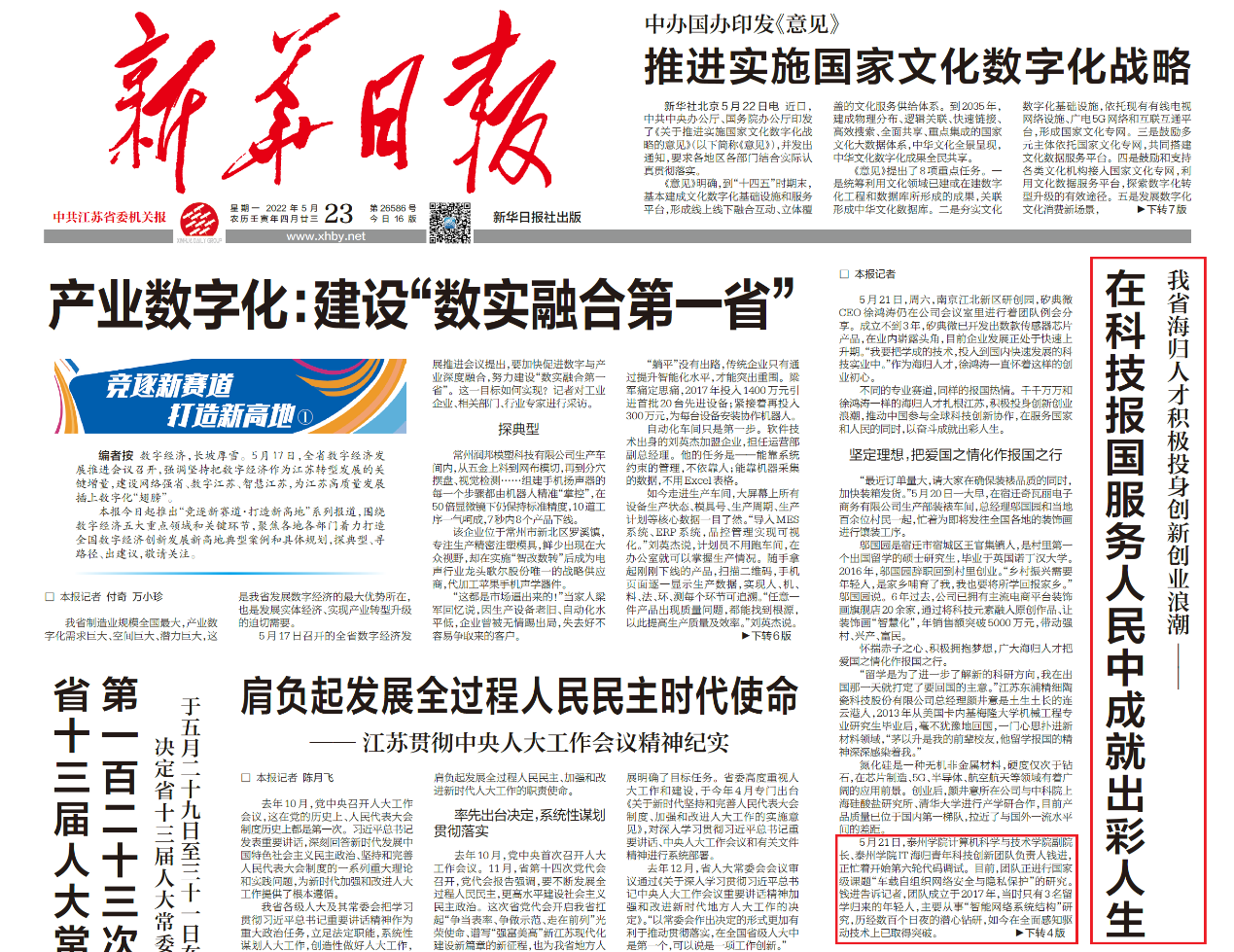 2022年5月23日,新华日报头版以“在科技报国服务人民中成就出彩人生”为题报道我院青年科技创新团队最新研究成果。我院青年科技创新团队不断促进科研成果转化,着力突破制约产业优化升级的关键核心技术,为地方经济发展和产业结构调整提供了强大助力。