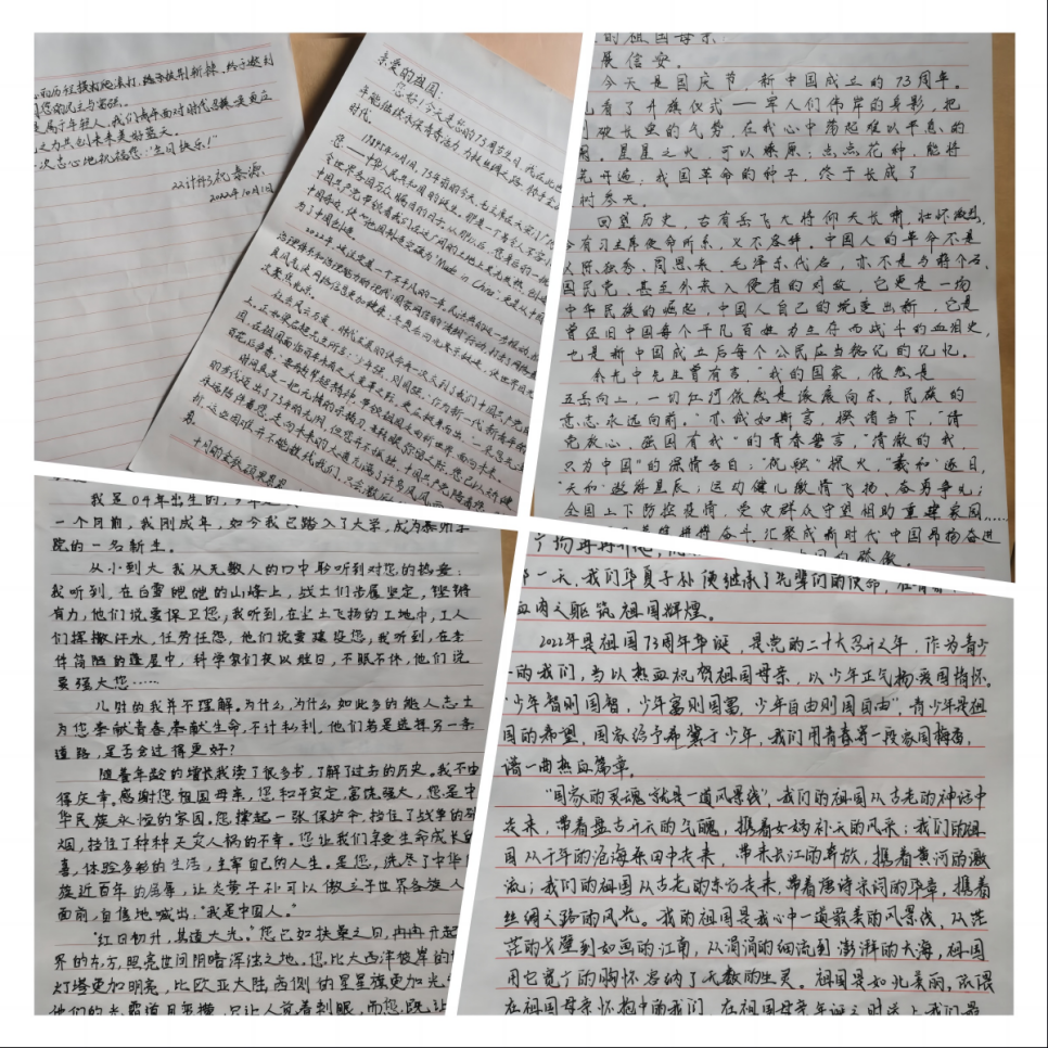 “以青春告白伟大祖国——给祖国母亲的一封信”手写征集活动中,大家用文字和赤诚之心真实有爱地告白祖国,通过“以小见大”的表达形式,歌颂祖国的繁荣富强,人民的幸福生活,抒发了青年学生“生在国旗下,长在春风里,目光所至皆为华夏”的民族自豪感和爱国情怀。活动先后收到征文20余篇,反响热烈。