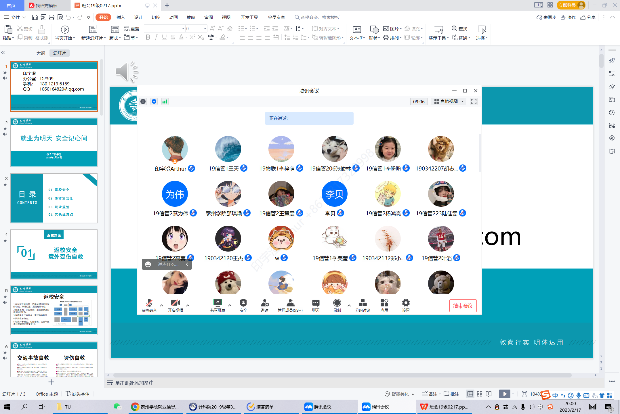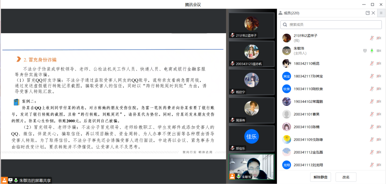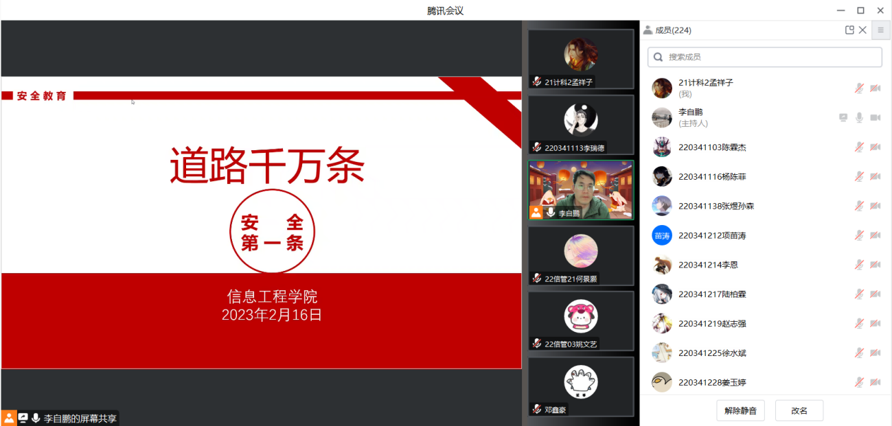 近日开学在即,为帮助同学们安全顺利地返校,提高防诈骗意识,更快地投入学习生活中,yl9193永利集团辅导员许红梅、朱敏浩、李自鹏和印宇澄老师分别于2023年2月16日在线上为各年级开展了“道路千万条,安全第一条”安全教育主题班会。