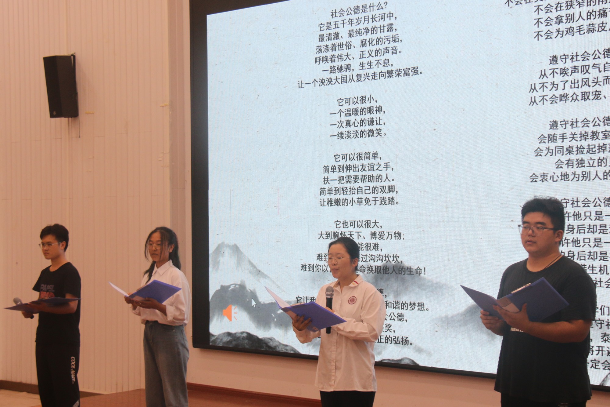 本次道德讲堂共设作省身、诵诗歌、看短片、讲故事、谈感悟、送吉祥等六个环节。活动伊始,同学们观看了有关校园文明现象的视频短片,通过图片、词云和现场扫码信息搜集等形式呈现出校园中存在的讲文明和不文明现象,结合自身实际以“三问三省”的形式进行深刻的自我反思。诗歌诵读《做一个有社会公德的人》,让同学们进一步理解礼貌待人、爱护环境的重要性。讲故事环节,明帝尊师重教和列宁排队理发的故事引发了学生们对文明礼仪和恪守公德的思考。
