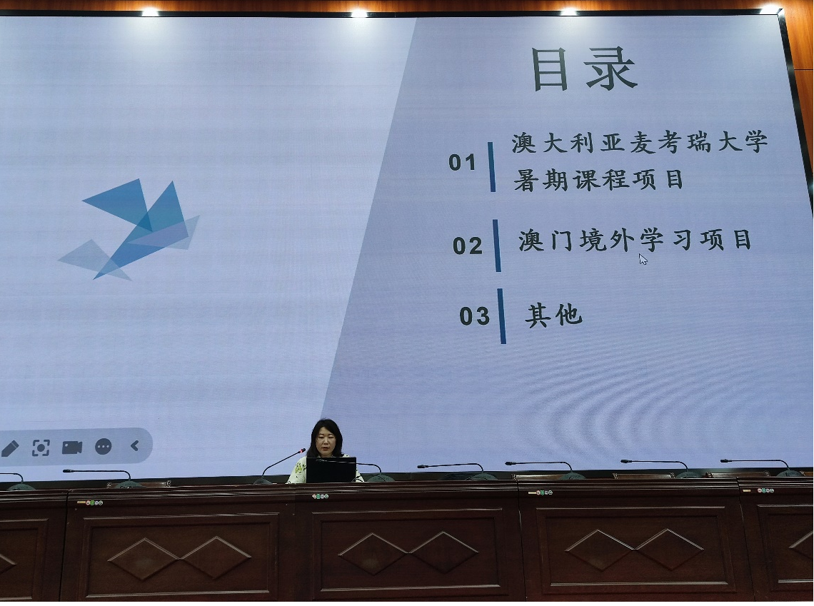 丁红霞老师介绍了澳大利亚麦考瑞大学暑期课程项目、澳门城市大学人工智能课程项目和澳门科技大学交流生项目等境外交流项目,展示了学院在国际合作和人才培养上取得的成绩,对学生如何申请此类合作项目给出了指导和建议。