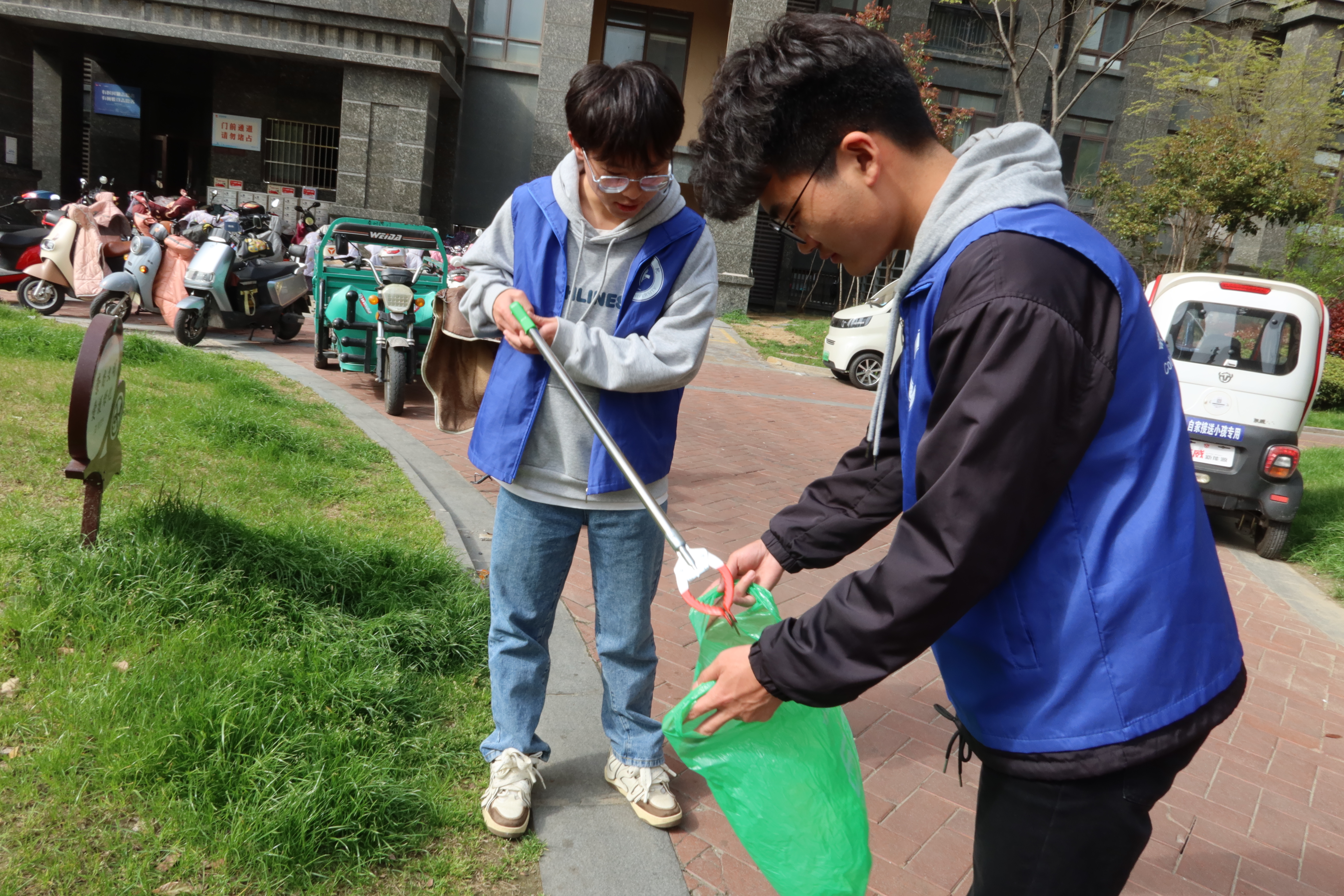 宣讲结束后,在辅导员老师的带领下,志愿者们两两一组,通过捡垃圾的方式为社区的绿化尽一份力量,激发自己的奉献精神,同时为文明城市创建贡献力量,使课余生活变得更加充实、更有意义。
