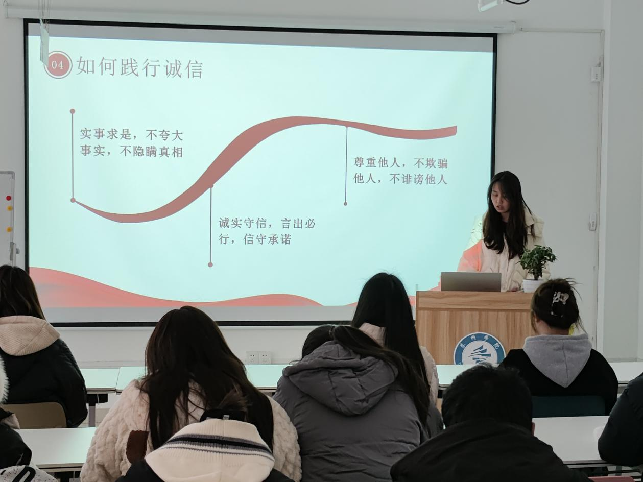 徐静冉结合党史讲述了老一辈共产党员在战争年代仍然坚守诚信,从而赢得民心的故事;王倩从个人成长经历出发,阐述了大学生应该如何践行诚守初心”;王易婷、孟昕玥诠释了何为诚信,为何诚信以及怎样发挥大学生自身的道德表率作用,从而使诚信美德在全社会蔚然成风。同时,四名学生党员结合校园生活实际,列举了学术造假、骗取助学金等不诚信反面案例,深刻剖析了这些行为带来的严重后果,引导学生们引以为戒,自觉坚守诚信底线。