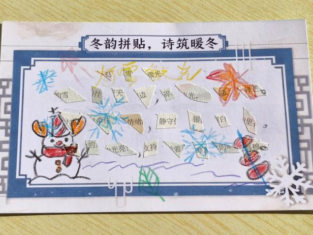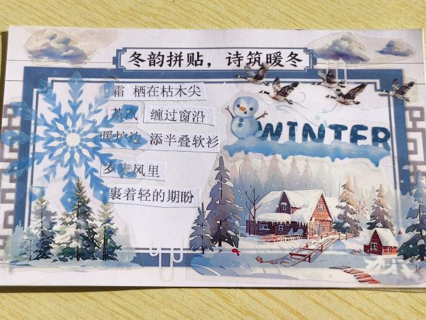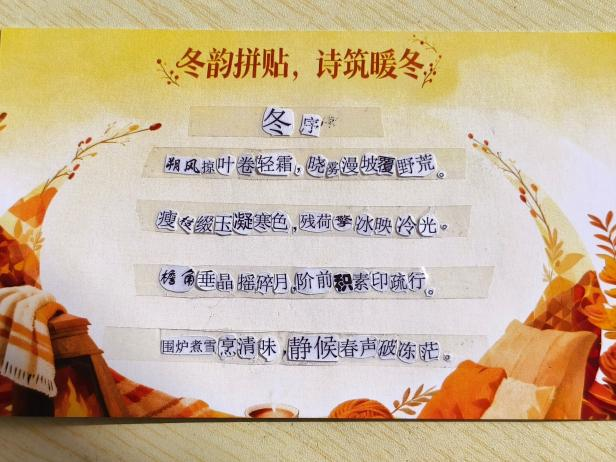 冬季蕴藏着落雪、暖阳、炉火等丰富意象,却常常在快节奏生活中被忽略。拼贴诗以“结构重组”的方式,让参与同学从旧报纸、演讲稿等载体中筛选文字符号,将零散的感受凝练成诗。