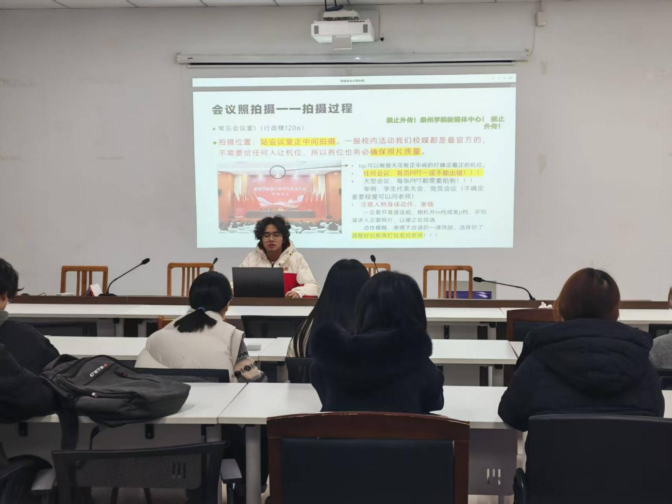 培训会特邀校新媒体中心摄影部副部长毕铭鑫同学担任主讲。他系统讲解了会议、讲座及各类活动场景下的拍摄规范与实用技巧。针对会议摄影,毕铭鑫提醒需提前到场熟悉环境、调试设备,合理安排空景与人物镜头,确保画面清晰、主体突出。他还结合校内常见场地,给出了具体机位建议。
