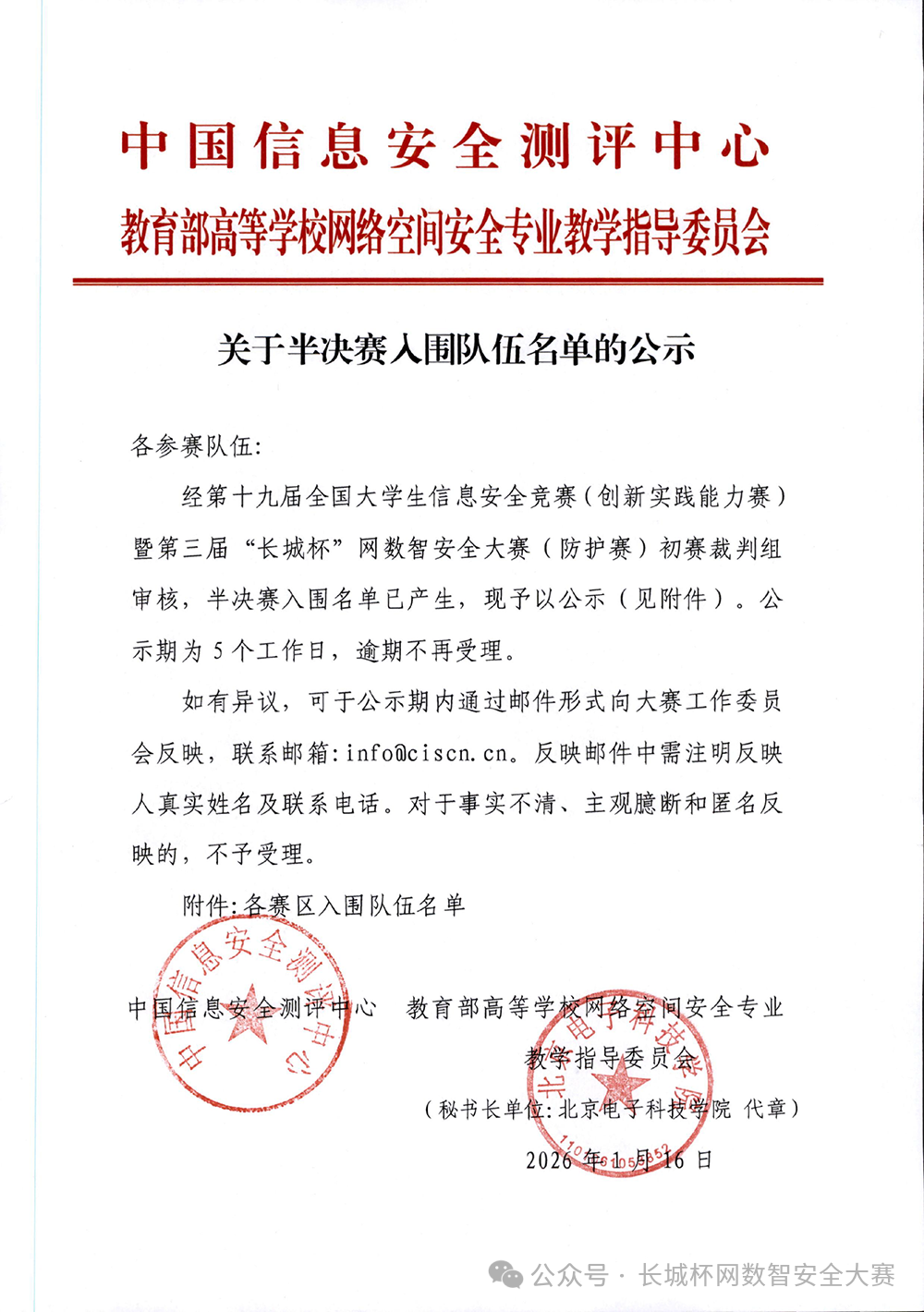 近日,从第十九届全国大学生信息安全竞赛(创新实践能力赛)暨第三届长城杯网数智安全大赛(防护赛)组委会传来喜讯,由我校yl9193永利集团网络空间安全专业学生组建的参赛队伍面向flag的编程(队长:24网安陈昊睿,队员:24网安胡思宇、24网安谈昌昊、25网安朱昊文)在初赛中表现优异,成功入围全国半决赛,展现了我院学子的专业实力与创新精神。