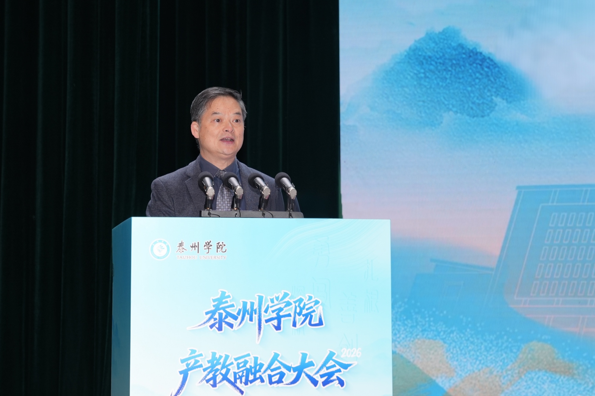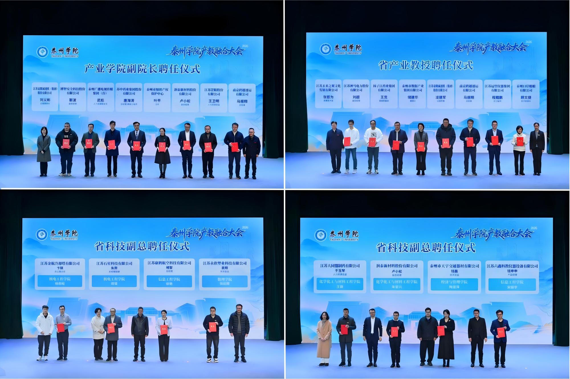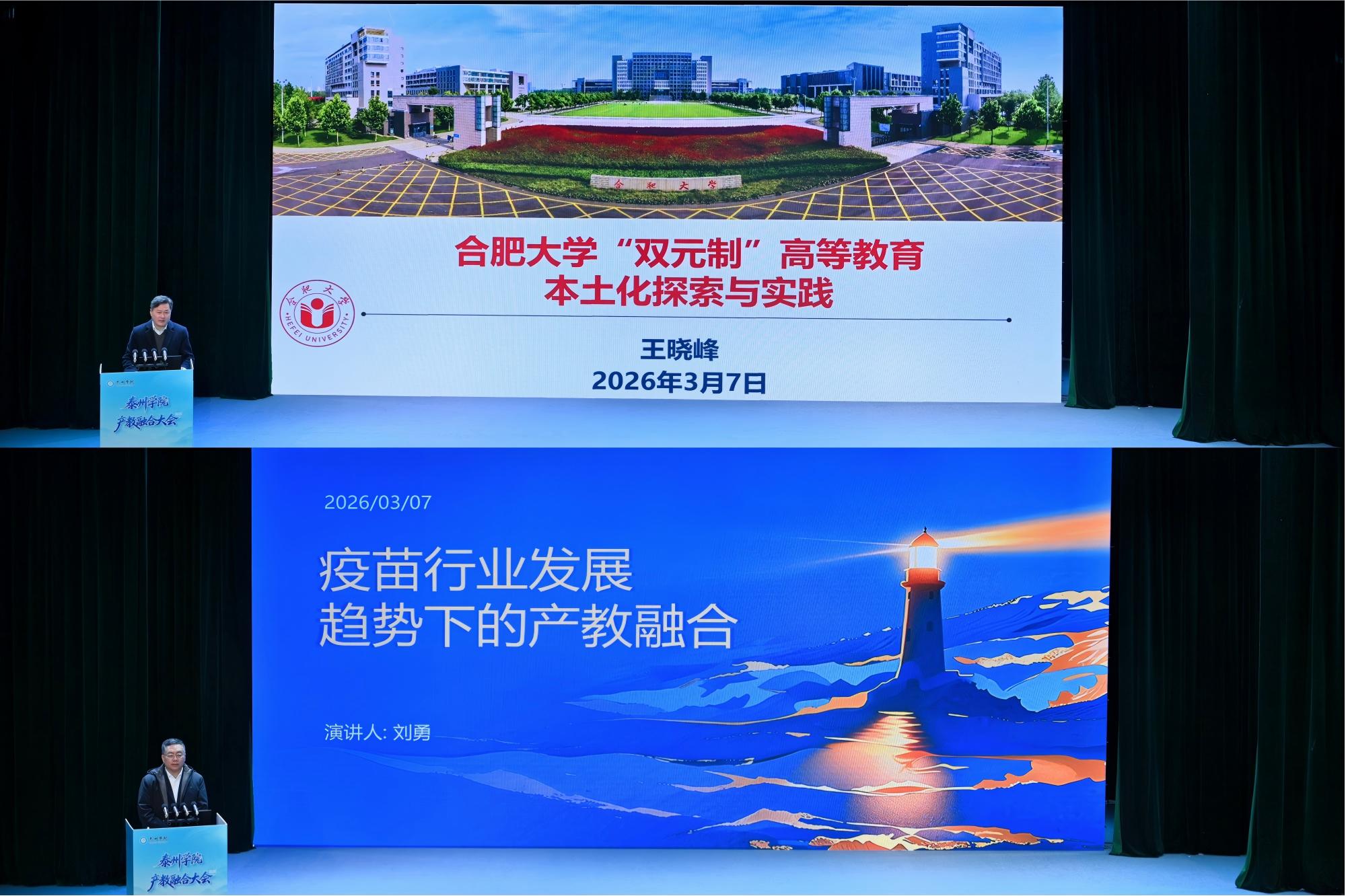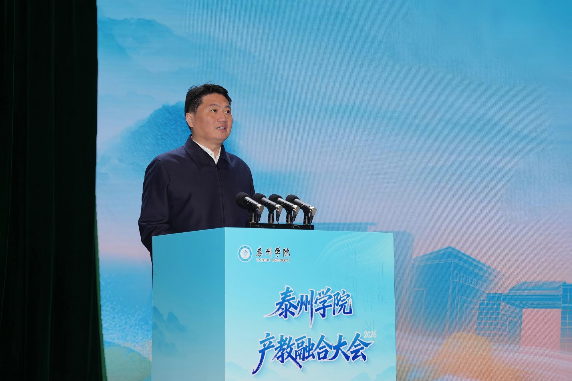 开幕式上,校党委书记徐向明致辞,全面回顾学校产教融合、校地校企合作成效。他表示,产教融合大会是我校2026年新春第一会,学校将以此次大会为契机,持续深化“三融三促”校城共兴计划,聚焦产业需求,完善协同机制,拓展合作领域,培养更多高素质应用型人才,为泰州发展提供坚实人才支撑和智力保障。大会播放的专题片,展现了学校发展成果与未来规划。