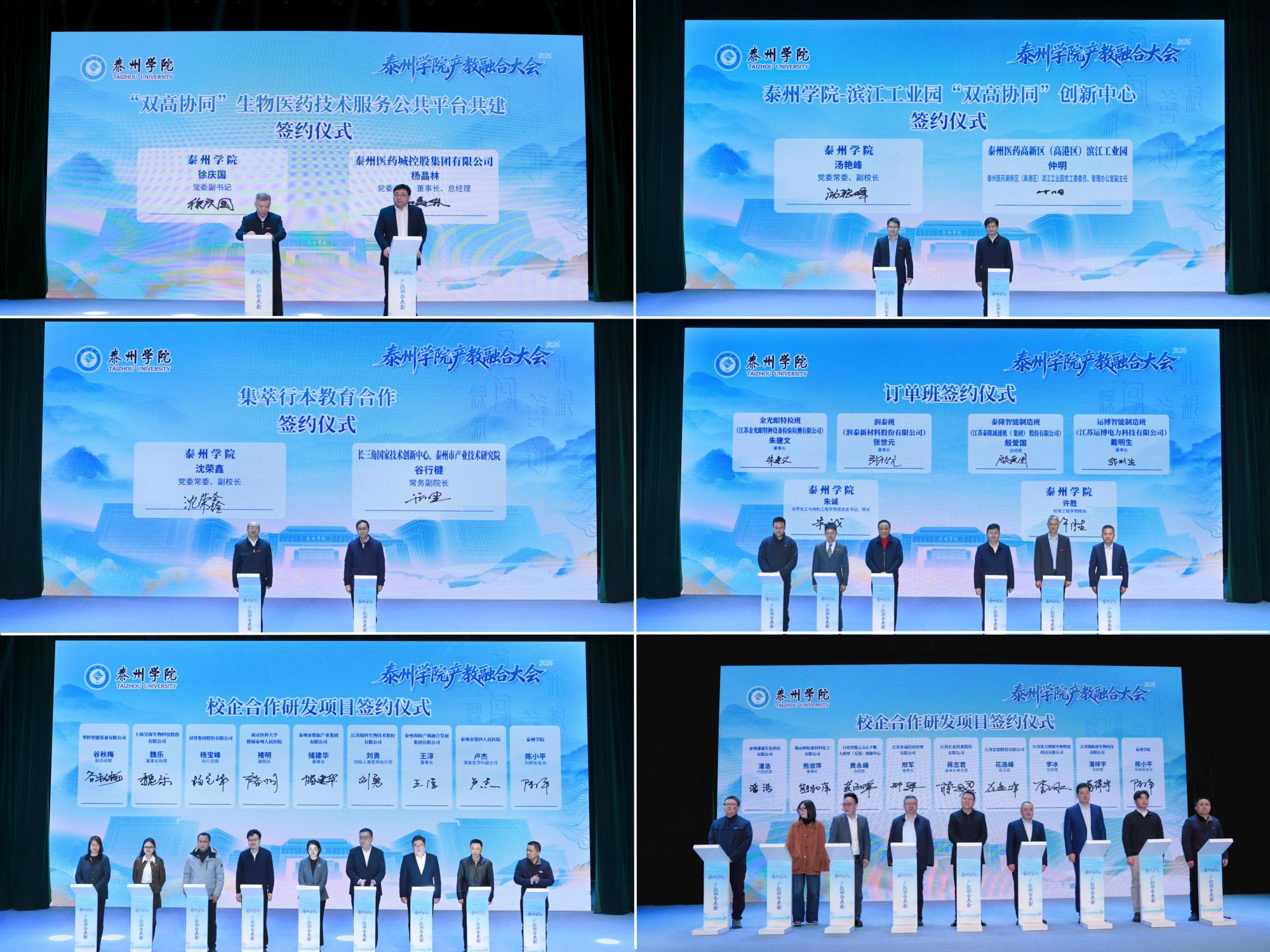 会上,一批校地校企合作项目集中签约。校领导班子成员代表永利集团与泰州医药城控股集团、滨江工业园、长三角国创中心共建创新平台和集萃行本教育实验班;与4家重点企业共建订单班,实现人才培养与企业需求精准对接;与16家企事业单位签订校企研发项目,覆盖生物医药、智能装备、新材料、数字经济等领域,推动科技成果加快转化。
