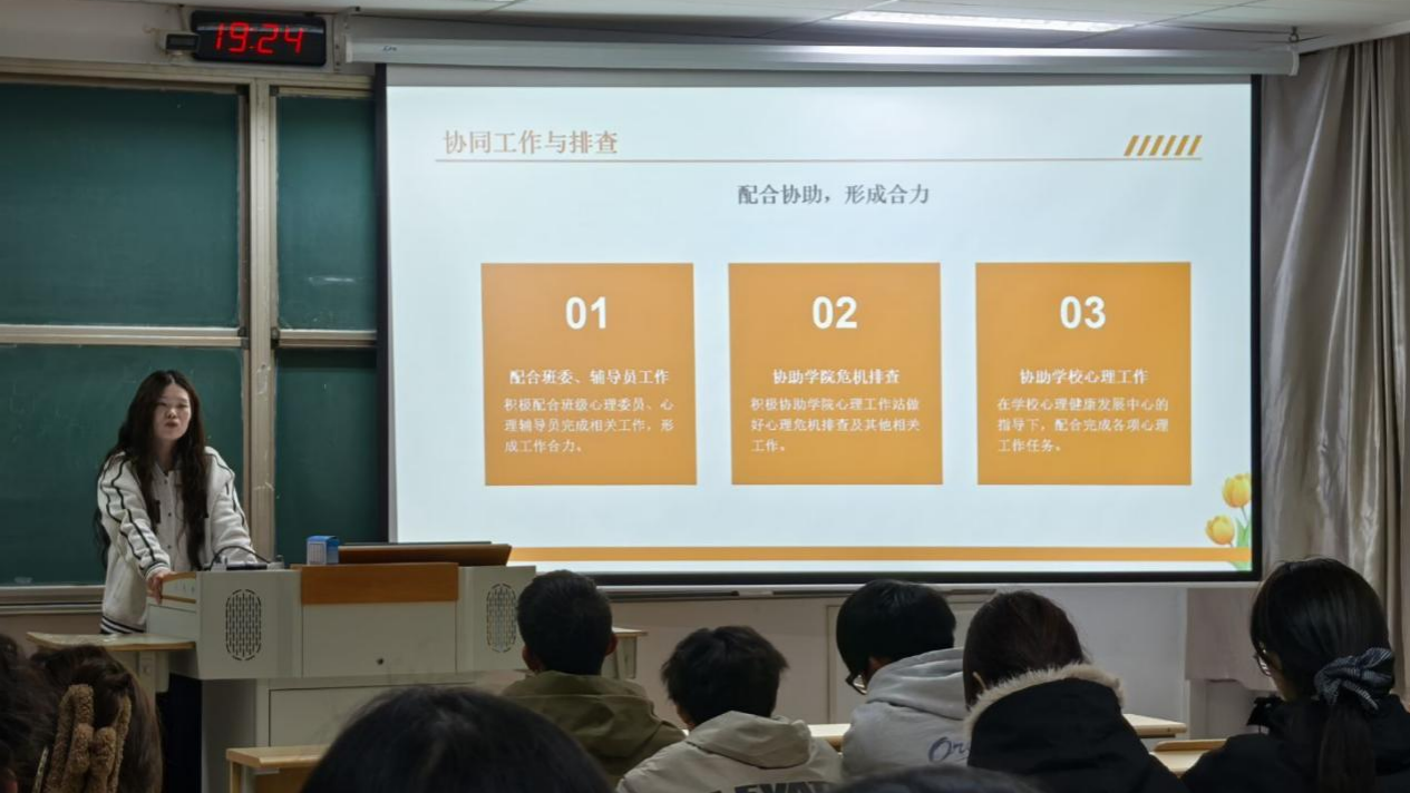 主讲人王梦如指出,心理委员与心理气象员作为“学校—学院—班级—宿舍”四级心理健康工作体系的重要力量,承担着知识宣传、活动组织、危机预警、朋辈支持等多重职能,全体参训同学要深刻认识心理健康工作的重要性,聚焦职责定位,强化责任担当。随后,王梦如结合典型案例,通过现场互动,指导同学们运用观察、倾听、共情等方式建立信任关系,她详细讲解了如何通过非语言信号,如眼神、肢体动作和开放性提问,拉近与同学的距离;在共情训练环节,她带领大家模拟“你看起来最近很累,愿意和我聊聊吗?”等表达方式,帮助同学们体会被理解的力量。同时,她重点强调了要及时发现并上报潜在异常情况,此外还宣传普及了心理援助的多种途径。